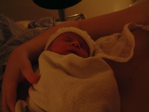 21:10, the new midwife takes over, and we’re off. Some half an hour or so of extreme effort (I nearly fainted with the psuedo–strain and sympathetic breathing!) and son number two emerges. A little nose–vacuuming and some oxygen (as he’s a bit blue — but not as bad as Zak was) and he seems to be fine. We even get a little cry, which we didn’t with Zak for his first 5 days. And this time, Kate’s with it enough to appreciate him straight off.